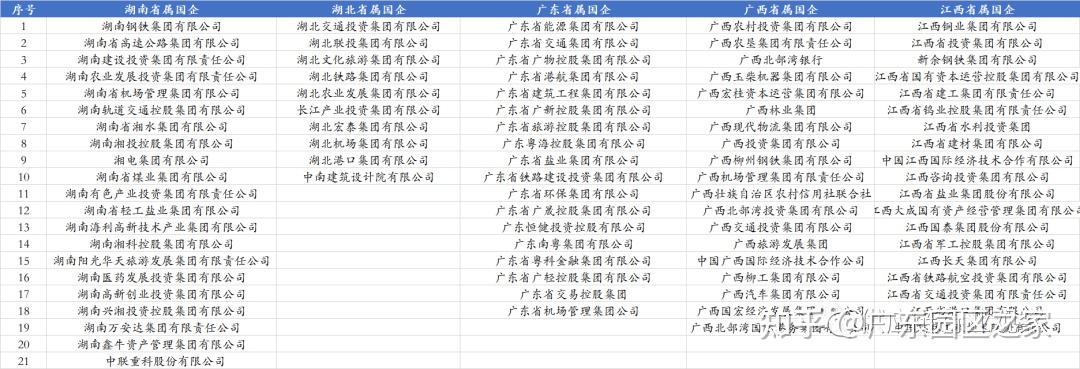 湖南、湖北、廣東、廣西及江西,這5個省份及省級行政區,共設立了87家省屬國企。其中湖南省21家、廣東省18家、廣西省19家、江西省19家。