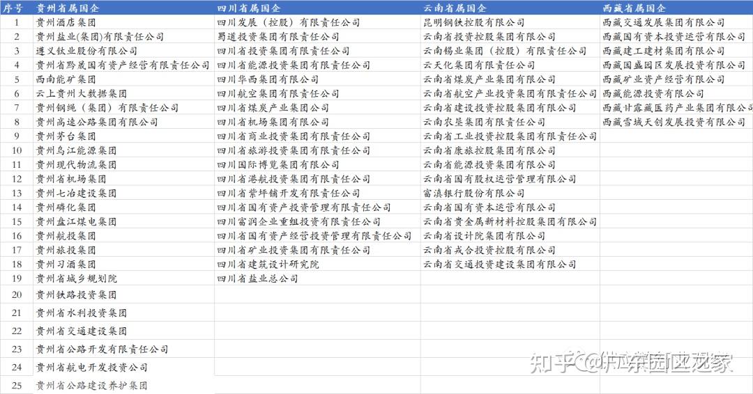 西南四省包括四川、云南、貴州和西藏,共70家省屬國企,其中四川省19家、貴州省25家、云南18家、西藏8家。